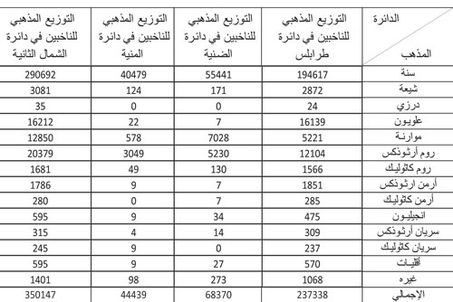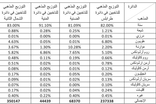 في التوزيع المذهبي للناخبين على مستوى الدائرة الكُبرى، كما يظهر الجدول، يُشكل السُنة قرابة الـ 83٪، يليهم الروم الأرثوذكس بنسبة قرابة الـ 6٪، العلويون 6،4٪، الموارنة 7،3٪ و1٪ من الشيعة.