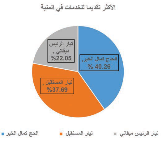 في المنية يقدم كمال الخير العديد من الخدمات إلى أهالي المنطقة خاصة عبر مروحة علاقات سياسية وإجتماعية واسعة جدًا، كما تميز بوقفات مطلبية ساهمت بتحقيق مكاسب لأهالي المنطقة كالزيادة في عدد ساعات التغذية الكهربائية، وتزفيت العديد من الشوارع في منطقة المنية. إعتبر القسم الأكبر من أهالي المنية 26،40٪ بأنه الأكثر تقديمًا للخدمات، يليه «تيار المستقبل» الذي مازال يحافظ على رصيد جيد له في المنطقة من خلال خدمات سابقة كانت قد توقفت منذ زمن للمنطقة، ويشكل الرئيس نجيب ميقاتي ذراع دعم لأهالي المنية على مستوى المنح التعليمية وبعض المساعدات الإجتماعية.