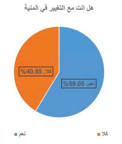 كذلك على مستوى التغيير، فقد كانت نسبة الذين يطالبون بالتغيير كبيرة وأتت 50،59٪ مقابل 95،40٪، حيث ستحتدم المعركة كثيرًا في ظل إنقسامات كبيرة شهدتها الساحة في المنية مؤخرًا.