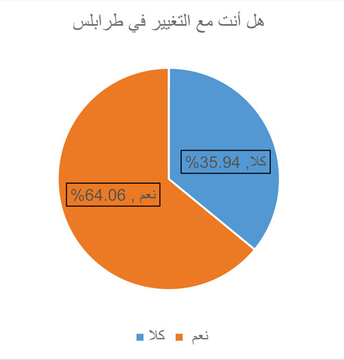 لا يختلف أحد ممن تناولهم الإحصاء أنَّ غياب الدولة في القيام بدورها يدفعهم للتوجه نحو السياسيين من أجل طلب هكذا خدمات، ويعترف القسم الأكبر بأهمية دور جمعية «العزم» في المدينة بالإضافة إلى دور الوزير كبارة، كما إعتبر كثيرون أنَّهم يفضلون أن تأتي الخدمات من الدولة وعبروا عن ذلك في الرسم البياني الآخر (هل أنت مع التغيير في طرابلس؟) والذي يطالب بالتغيير وبنسبة 60،64٪، بحيث كان المطلب الأول هو التوجه نحو فرض تأمين الصحة والتعليم للجميع لكي يخرج المواطن من دوامة التبعية الخدماتية. أما نسبة الـ94.35٪ ممن هم ضد التغيير فيعتبرون جزءاً من المُقتنعين بخط سياسي مُعيَّن.