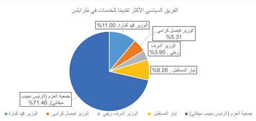 في طرابلس أتت «جمعية العزم والسعادة» التابعة للرئيس نجيب ميقاتي في رأس القائمة كأكبر فريق سياسي يقدم خدمات، وبنسبة مرتفعة تُجسد تمامًا العمل الحقيقي الذي تقوم به الجمعية، دون أي توقف وبوتيرة متقدمة. أهم الخدمات التي تقوم بها جمعية «العزم» تدور في فلك: المساعدات المدرسية (منح تعليمية لأهالي طلاب المدارس والجامعات)، المساعدات الصحية وهي على نوعين (الكشف الصحي من خلال الأطباء ضمن سلسلة من المستوصفات، وإستشفاء في كل ما يخص الإستشفاء من عمليات)، المساعدات الإنمائية للمناطق (ترميم الأسواق، الحفاظ على التراث الثقافي والديني، تزفيت بعض الطرقات، وفي الحالات الطارئة …)، المساعدات الإجتماعية للعائلات صاحبة الدخل المحدود وفي المناسبات. أما خلف تيار العزم فيأتي الوزير محمد كبارة الذي يساهم من خلال وجوده ونجله كريم في تقديم العديد من الخدمات والوقوف إلى جانب أهالي المدينة. وفي المركز الثالث يأتي «تيار المستقبل» الذي كان في مراحل زمنية سابقة يتقدم على الجميع في المدينة على مستوى الخدمات التي بدأت تتراجع منذ سنوات وبوتيرة متسارعة حتى وصلت إلى ما هي عليه، مع العلم أنَّ بعض الخدمات المحدودة عادت لتظهر مؤخرًا بعد إستلام أحمد الحريري لملف طرابلس. كما يحفظ الوزير فيصل كرامي مركزًا له في تقديم الخدمات الصحية في المدينة بالإضافة إلى بعض الخدمات الأُخرى المحدودة. ويحل الوزير أشرف ريفي في مرحلة متأخرة نظرًا لكونه جديد في الساحة السياسية وهو حالة لم ترتق بعد إلى مستوى العمل المؤسساتي الخدماتي الممنهج.
