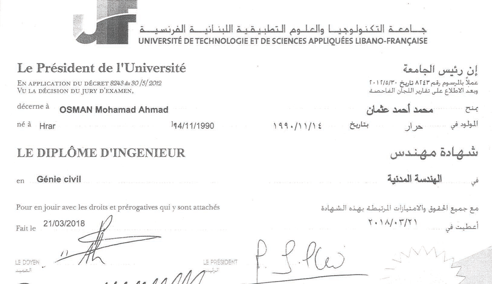 الشاب محمد أحمد عثمان من «جامعة التكنولوجيا والعلوم التطبيقية اللبنانية الفرنسية».