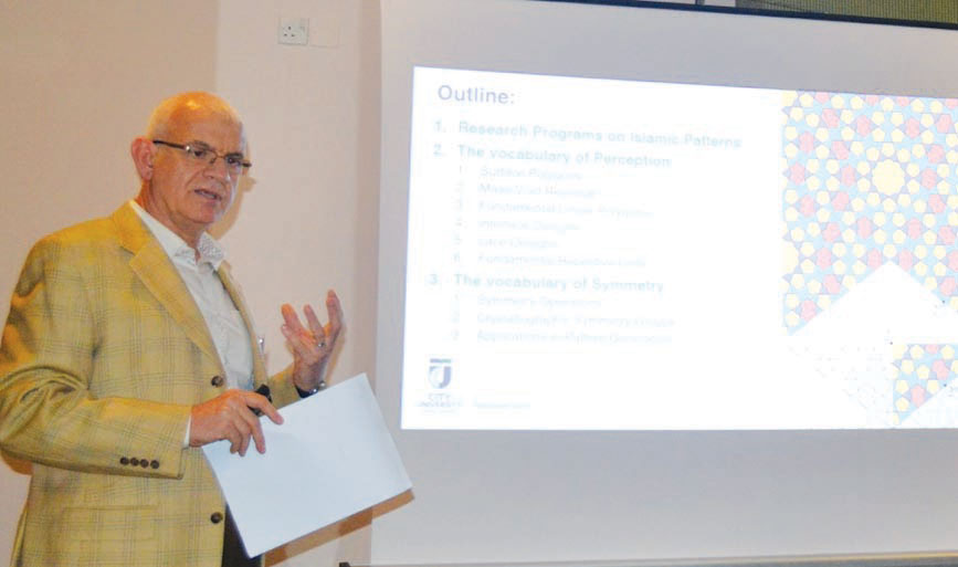 – وفصّل فن الزخارف كلغة إدراك حسّي وبصري لها مفرداتها ونُظمها الهندسية العلمية المتكاملة مفكّكاً بعض التصاميم وكاشفاً «الكامن من هيكلها الهندسي».