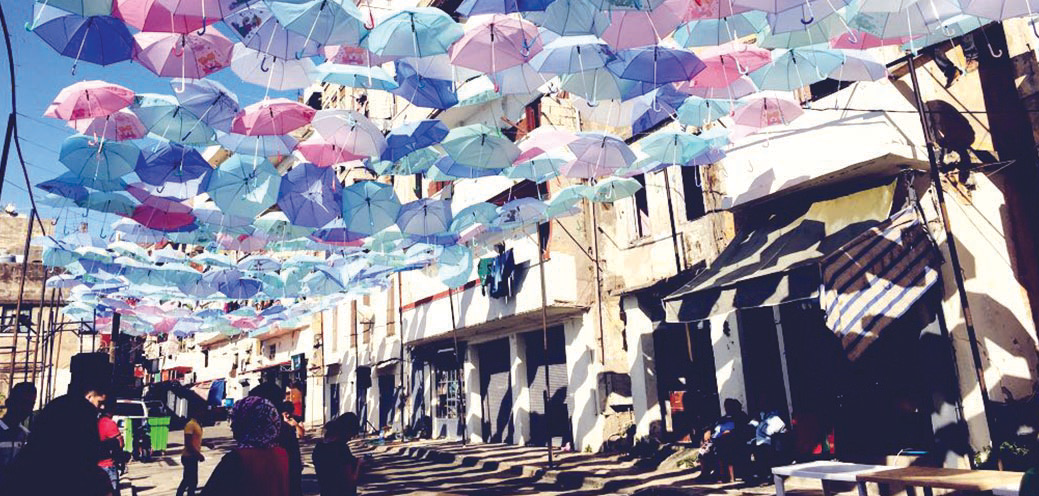 – سقف جزء من الحارة بالمظلات.