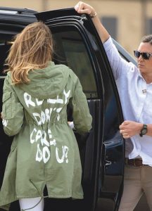 والصورة الثانية هي لسترة «ميلانيا ترامب» زوجة الرئيس الأميركي، التي كُتِبَ عليها: