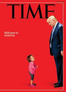 باختصار، الصورة الأولى هي غلاف مجلة «التايم» الأميركية بعددها الذي صدر في 2/7/2018، حيث ظهر طفلة هندوراسية عمرها سنتان باكية، تقف بوجه الرئيس الأميركي «دونالد ترامب» العملاق وهو ينظر بخفة إلى تلك الطفلة الدامعة.