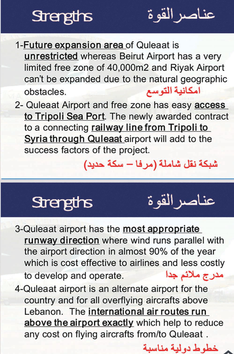 اضاف: «مطار بيروت اصبح محدوداً جغرافيا، فالعمران وصل حدوده ولم يعد بالامكان وضع رؤية جديدة للمنطقة الحرة ومنطقة الشحن فيه، لذلك فان مطار القليعات يستطيع خدمة عدة اهداف منها: