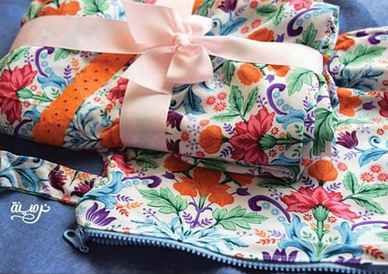 تدخل ورشتها الخاصة في منزلها، غرفة هادئة مرتبة، فهنا منشر غسيل عُلقت عليه بعض الأقمشة المرسومة بحنان، وهناك حائط لباقات مرسومة ومكتوبة، أنجزتها وأحبتها فعلقتها، بعض الخشب الملون والحقائب، صورة لفيروز الحالمة وأخرى لمحمود درويش شاعر الهوى العربي… ووراء باب الغرفة أكياس أنيقة بيضاء مكتوب عليها اسمها باللون الزهري، فيها تضع «نرمينة» أشياءها الحبيبة ولتوصلها إلى أصحابها وقد مهرتها ببطاقة صغيرة جداً تلتف على عنق الهدية.