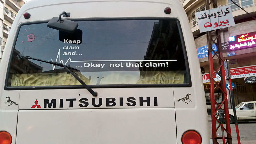 قد تقف لدقائق متسائلاً ما معنى «Clam»؟ ثم تضحك حين تكتشف بنفسك أن من كتب العبارة على السيارة، قصد بها «Calm» «الهدوء»؟