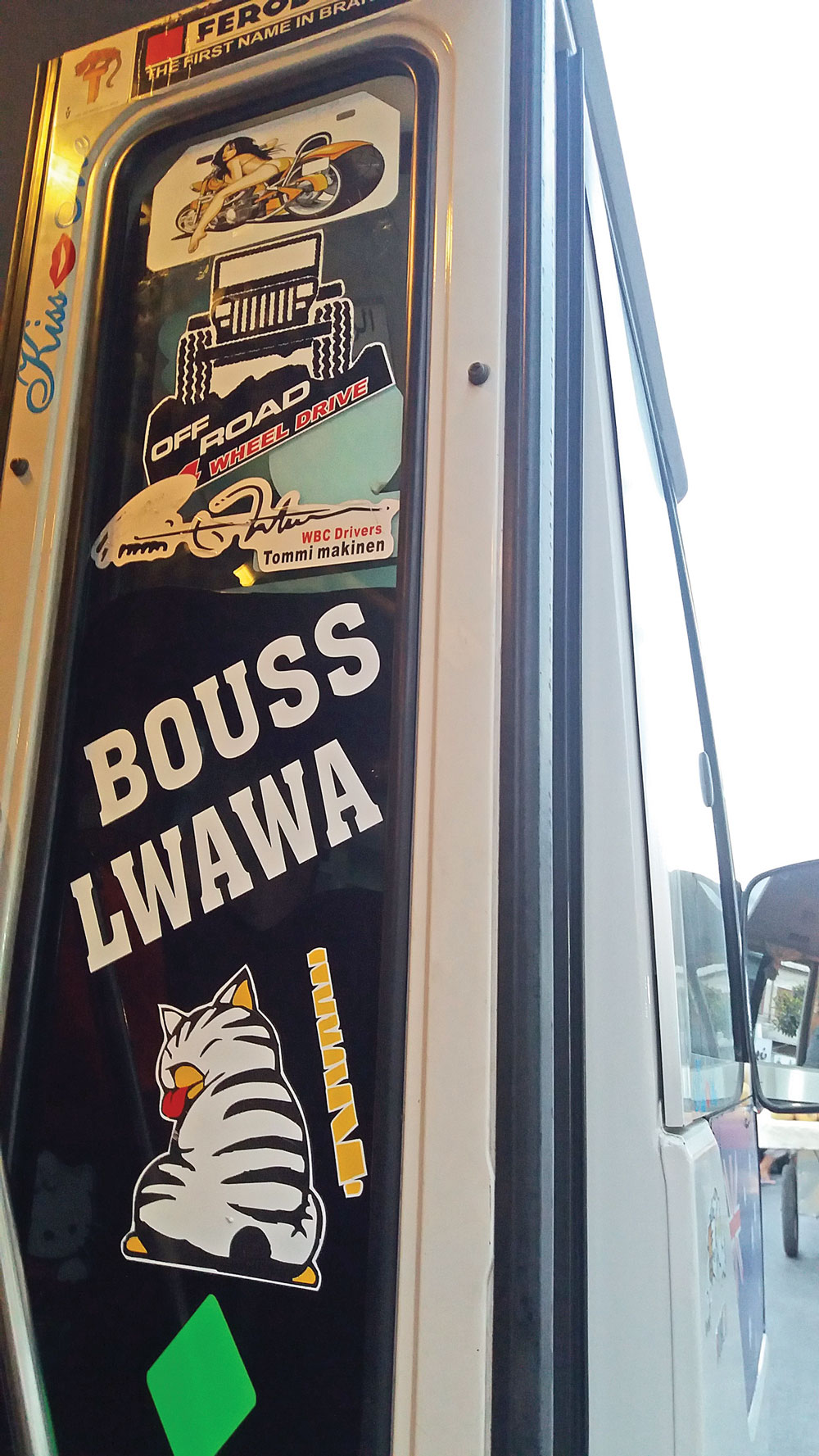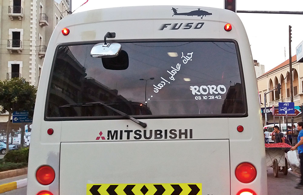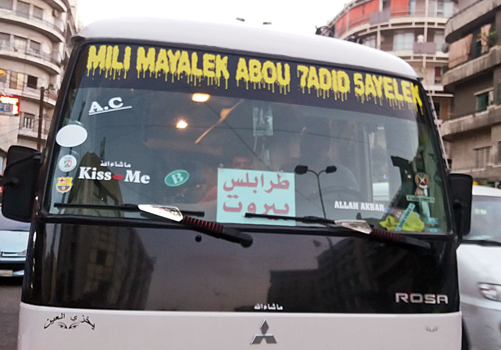 هذه حافلة تتنقل يومياً من طرابلس إلى بيروت وبالعكس، تحاصرك كتابات على زجاج السائق وفوق رأسه يميناً وشمالاً، وحتى بين المقعدين الأماميين: