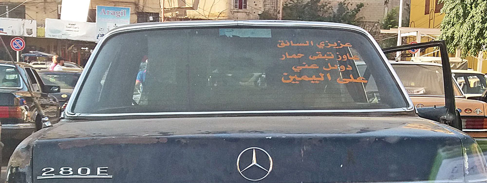 «لا تحط أجرك فوق»، كل ذلك يقدح قريحتك ان تبحث أكثر عن عبارات جديدة، يكتبها السائق على سيارته، من الداخل أو من الخارج على حد سواء…