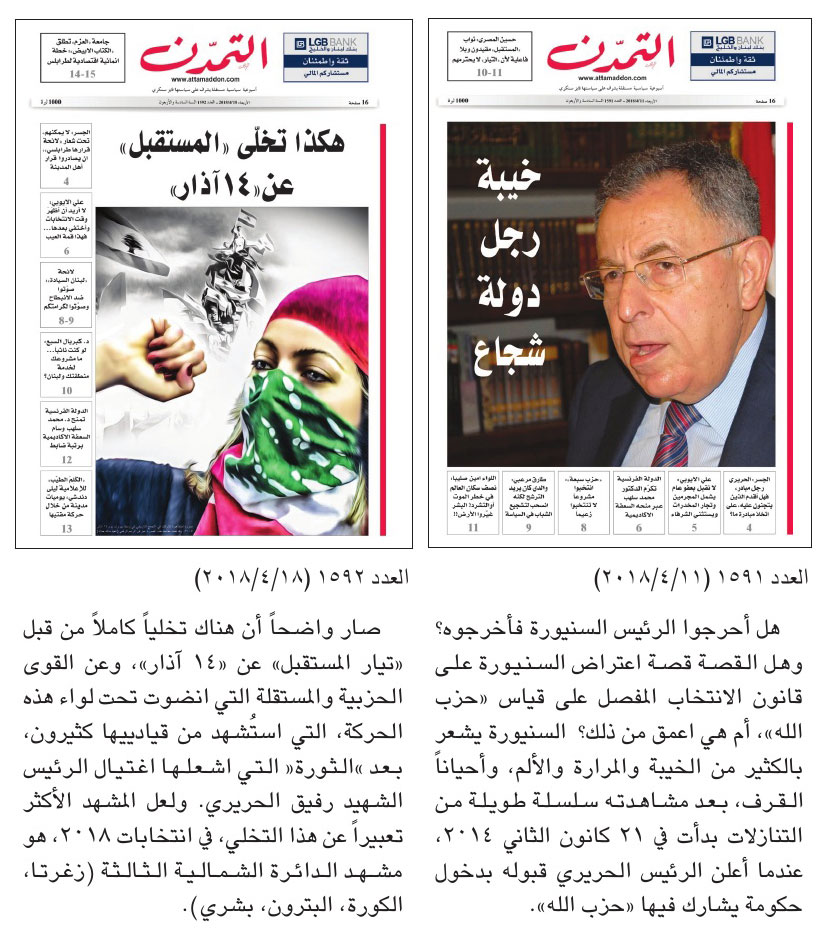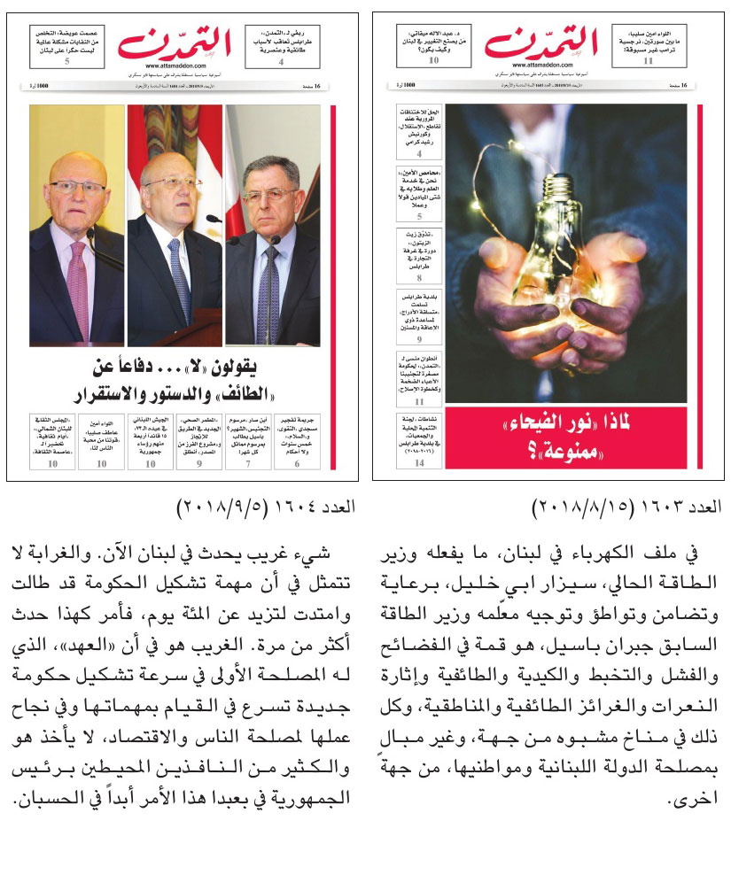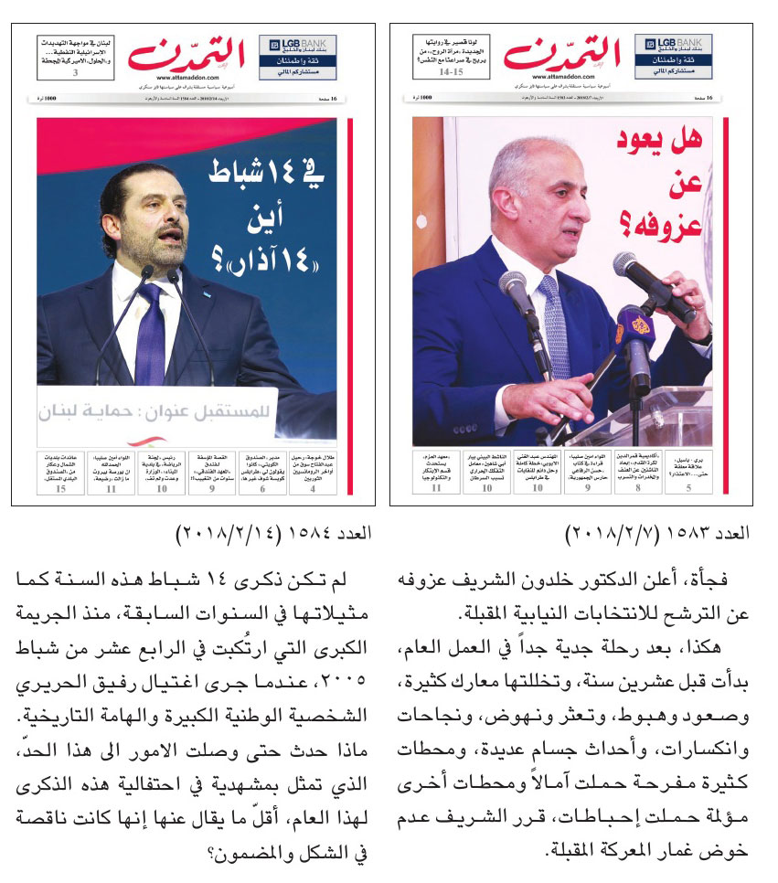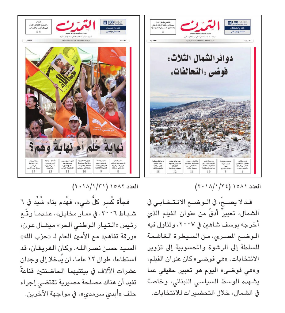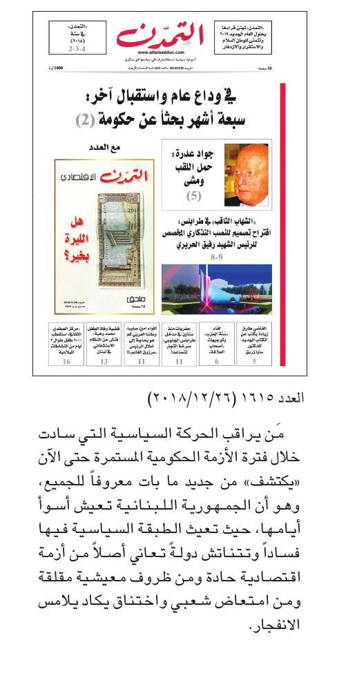 يرحل العام 2018 وقد أرخى بثقله على المواطنين الحزينيين الذين يستعدون لاستقبال عام جديد، آملين أن يأتي الفرج من مكان ما، فيما كل الدلائل تشير إلى ان هذا الفرج بعيد، طالما أن هؤلاء الحاكمين باقون وطأالما ن الشعب التعيس ما زال يُجدد الثقة بهم كما فعل في الانتخابات النيابية الأخيرة في الربيع الماضي. في الصفحات 2 و3 و4 تنشر «التمدن» أغلفة الأعداد التي أصدرتها خلال العام 2018 مع مقاطع صغيرة مقتطعة من موضوعاتها الافتتاحية.