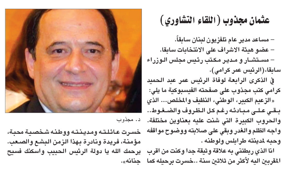 في الذكرى الرابعة لوفاة الرئيس عمر عبد الحميد كرامي كتب مجذوب على صفحته الفيسبوكية ما يلي: