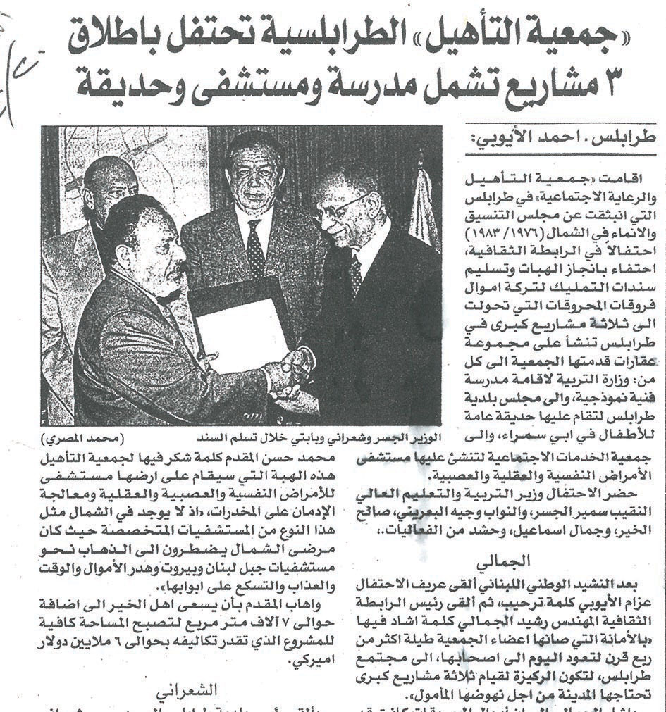 «في ظل ما نشهده اليوم من آفات الفساد وضياع الأمانة وفقدان المسؤولية تبرز أمامنا قضية شامخة في معانيها مؤثرة في نتائجها عميقة في ضمير نخبة أعطت المثال الحي في مسيرتها، إنها «جمعية التأهيل والرعاية الاجتماعية» التي انبثقت عن «مجلس التنسيق والإنماء» الذي عَرفَتْهُ أحداث الحرب عام 1975.